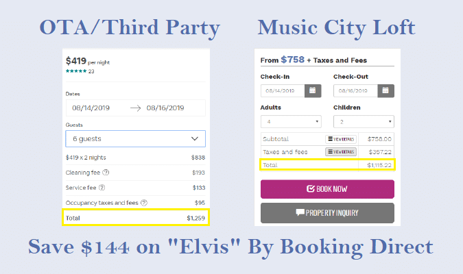 Check out these examples of the cost for the same room on the same dates when you book with an OTA/ third party booking site vs. booking direct with Music City Loft: